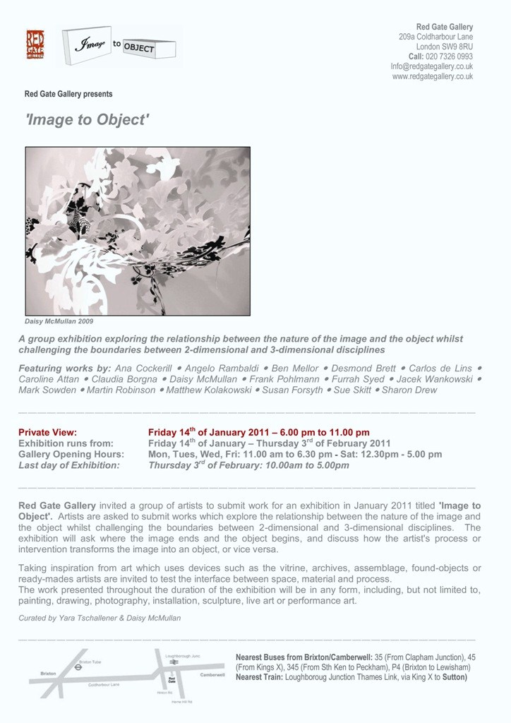 - At the Red Gate Gallery in London in 'Image to Object' from 14th January to 3rd February 2011. See press release and catalogue entry.